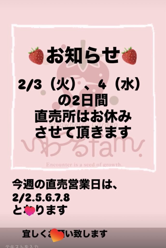 2月3日と4日は東京でのイベントに参加の為、 直売所はお休みになります 5日から通常通り営業致しますので、よろしくお願いします